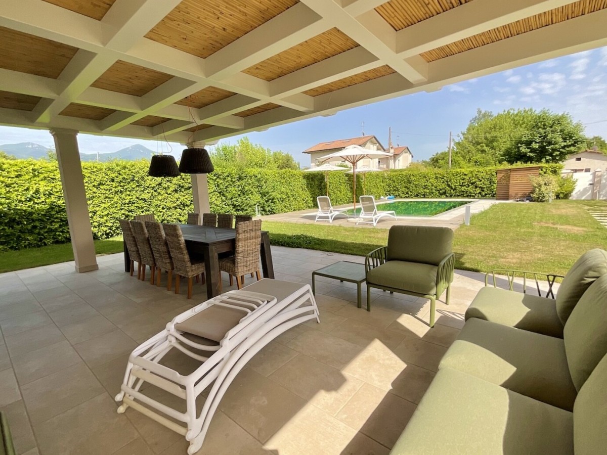 The large patio is perfect for relaxing and dining outdoors, overlooking the pool equipped with umbrellas and sun loungers for maximum comfort.